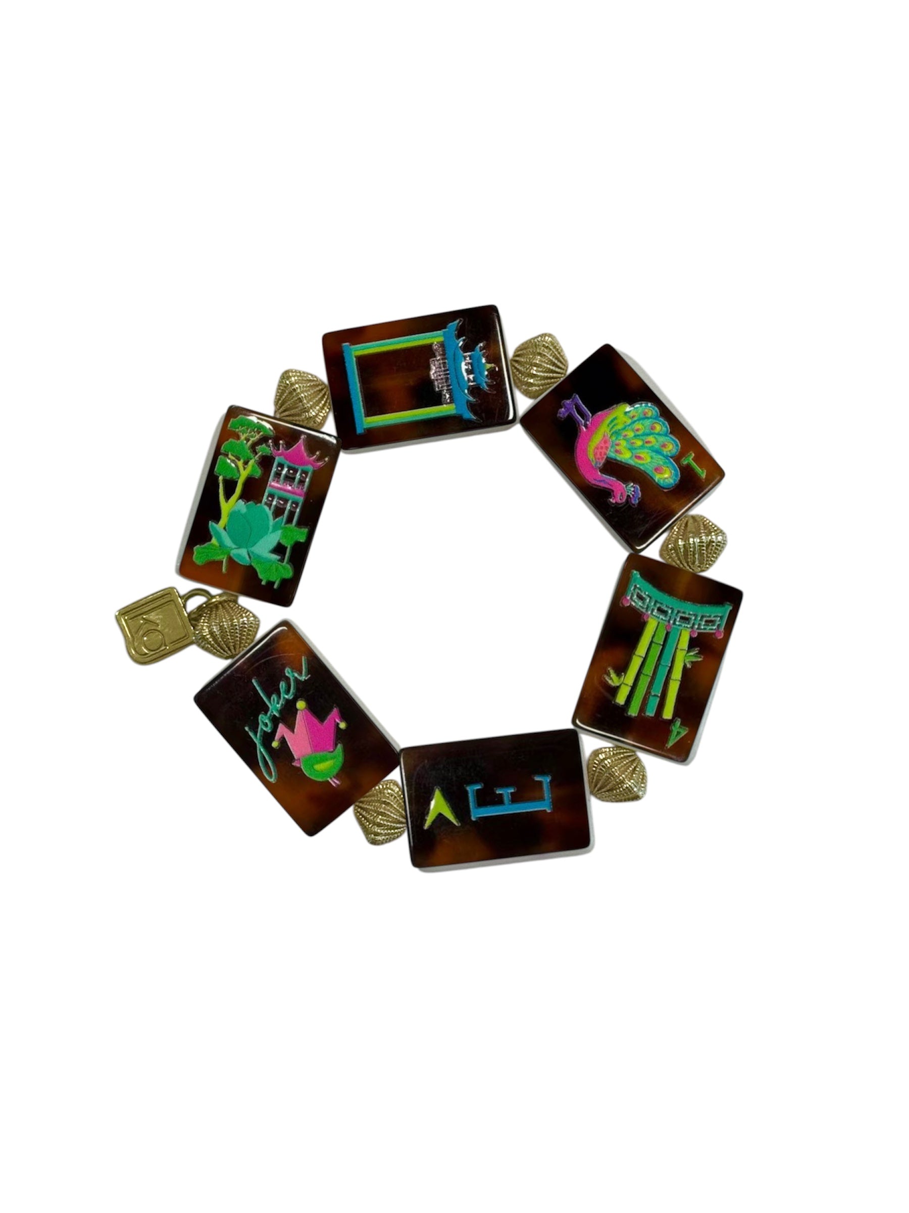 PRESALE! Bring a pop of color to your game with this eye-catching tortoise mahjong tile bracelet. Each hand-painted neon character pops against the warm tortoise backdrop, textured gold spacers between tiles. Perfect for mahjong enthusiasts and bold accessory lovers alike. One size fits most.