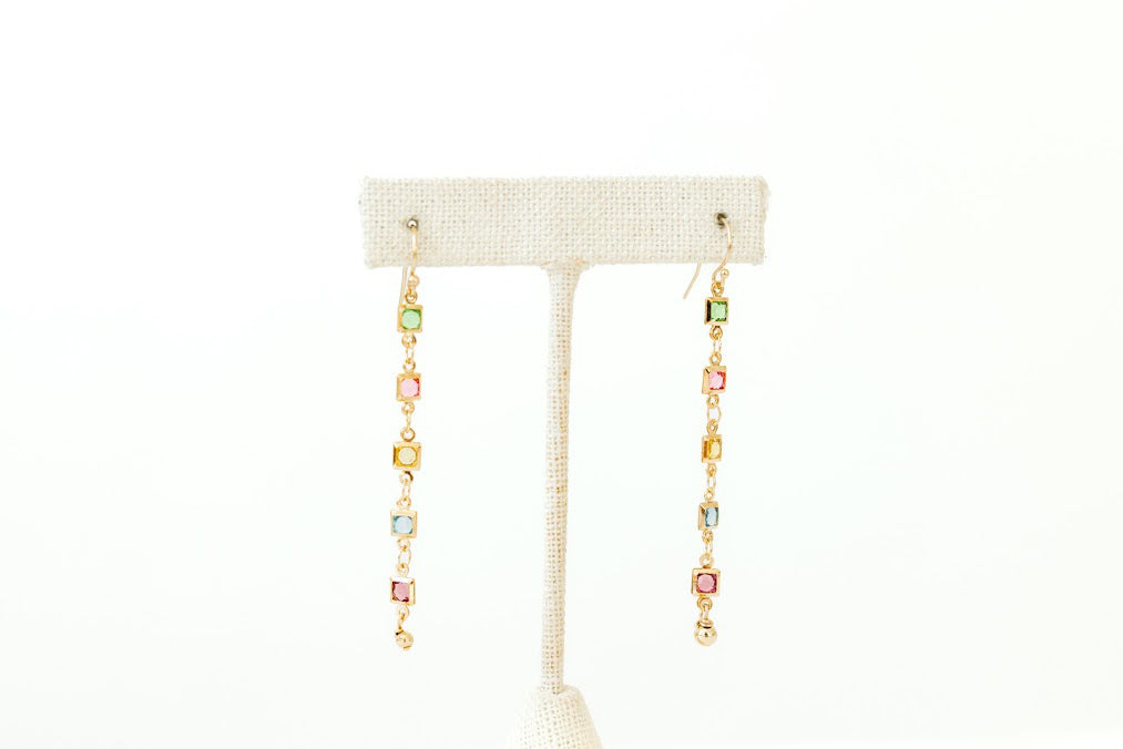 Bezel set multi color stones cascade from a goldfill earwire for a modern look. Length 3”