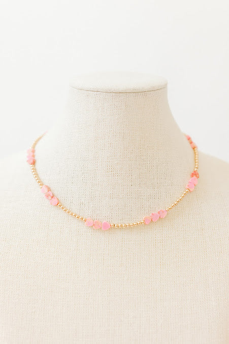 Add a pop of playful charm to your look with this 16-17" necklace featuring delicate 3mm gold-filled beads accented by adorable pink jasper heart charms. Light and vibrant, it’s the perfect way to wear a little love every day.