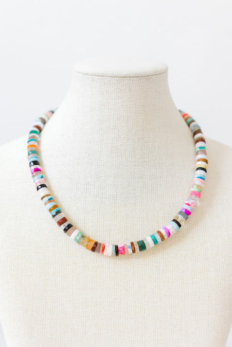 Add a touch of vibrant charm to your style with this handcrafted Heishi bead necklace. Featuring an eclectic mix of natural stones and colorful beads, each piece is thoughtfully arranged to create a playful yet timeless design. The smooth, disk-shaped beads give it a relaxed, bohemian feel—perfect for layering with other jewelry or wearing on its own as a statement piece. Large gold plated clasp closure