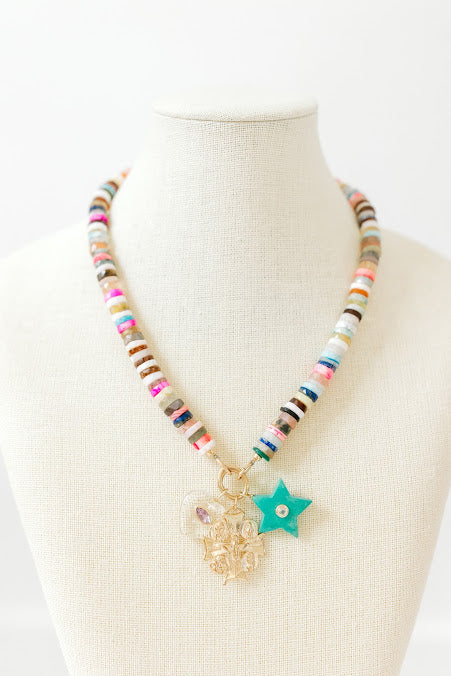 Our absolute favorite combo!!! Multi color semiprecious sliced beads with dual closures. Adjustable length clapping the back and the front charm closure allows you to add and subtract pendants. As shown with large gold cross, clear heart with Amythest stone and turquoise star.
