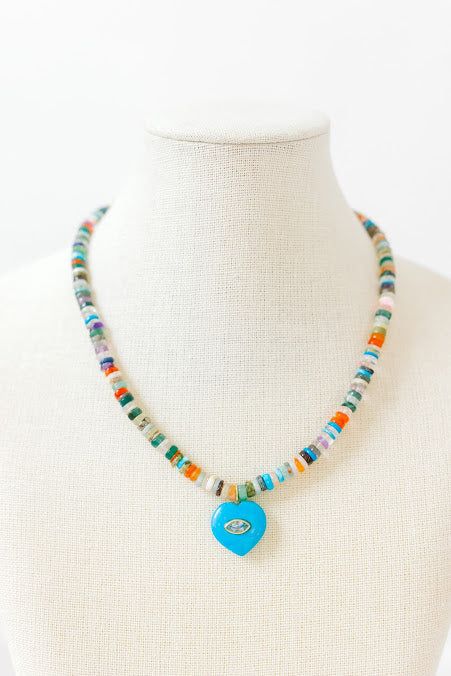 Brighten your look with Heartstring, a playful necklace featuring small sliced multi semi-precious stones that bring a splash of color and charm. The centerpiece is a turquoise heart pendant, accented by a sparkling blue topaz faceted stone for just the accent. At up to 17" long, it’s perfect for layering or wearing solo to add a fun and vibrant twist to any outfit.